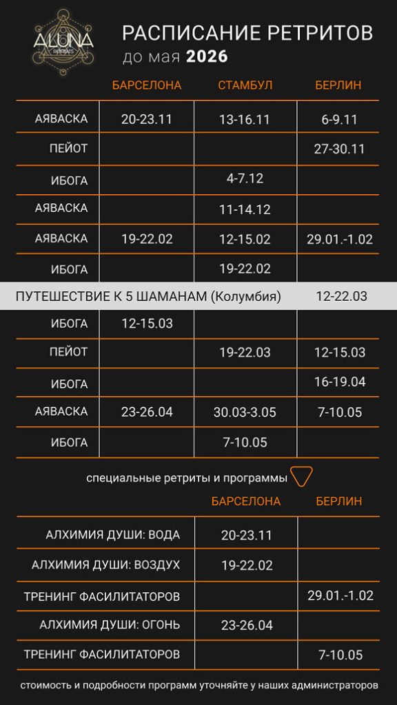 Обращаем ваше внимание: Алуна Ретритс не занимается продажей Аяваски, Ибоги, Пейота и другой сакральной медицины. И мы никому не рекомендуем использовать ее вне соответствующей традиции и без грамотного проводника.